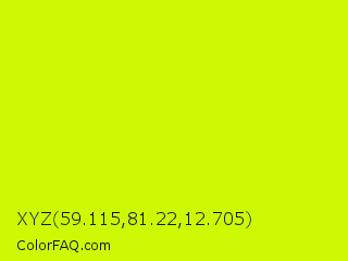 XYZ 59.115,81.22,12.705 Color is a normal lime color and the nearest color is Electric Lime #ccff00. Hex code #ccfa05 and RGB value is rgb(204,250,5). In RGB color space, this color is composed of 80% red, 98% green, 2% blue, In CMYK color space, this color is composed of 18% cyan, 0% magenta, 98% yellow , 2% black , In HSL color space, this color has a hue angle of 71° , 96% saturation and 50% lightness.