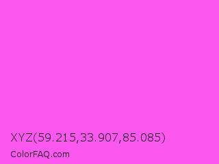 XYZ 59.215,33.907,85.085 Color is a light magenta color and the nearest color is Pink Flamingo Crayola #ff66ff. Hex code #fc58ef and RGB value is rgb(252,88,239). In RGB color space, this color is composed of 99% red, 35% green, 94% blue, In CMYK color space, this color is composed of 0% cyan, 65% magenta, 5% yellow , 1% black , In HSL color space, this color has a hue angle of 305° , 96% saturation and 67% lightness.