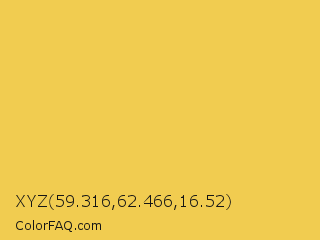 XYZ 59.316,62.466,16.52 Color is a light yellow color and the nearest color is Ronchi #ecc54e. Hex code #f1cc50 and RGB value is rgb(241,204,80). In RGB color space, this color is composed of 95% red, 80% green, 31% blue, In CMYK color space, this color is composed of 0% cyan, 15% magenta, 67% yellow , 5% black , In HSL color space, this color has a hue angle of 46° , 85% saturation and 63% lightness.