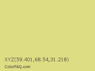 XYZ 59.401,68.54,31.218 Color is a light yellow color and the nearest color is Flax #eedc82. Hex code #dcdd82 and RGB value is rgb(220,221,130). In RGB color space, this color is composed of 86% red, 87% green, 51% blue, In CMYK color space, this color is composed of 0% cyan, 0% magenta, 41% yellow , 13% black , In HSL color space, this color has a hue angle of 61° , 57% saturation and 69% lightness.