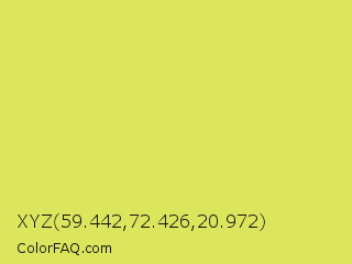 XYZ 59.442,72.426,20.972 Color is a light yellow color and the nearest color is Maximum Green Yellow #d9e650. Hex code #dbe65c and RGB value is rgb(219,230,92). In RGB color space, this color is composed of 86% red, 90% green, 36% blue, In CMYK color space, this color is composed of 5% cyan, 0% magenta, 60% yellow , 10% black , In HSL color space, this color has a hue angle of 65° , 73% saturation and 63% lightness.
