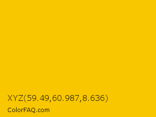 XYZ 59.49,60.987,8.636 Color is a normal yellow color and the nearest color is Golden Poppy #fcc200. Hex code #f9c700 and RGB value is rgb(249,199,0). In RGB color space, this color is composed of 98% red, 78% green, 0% blue, In CMYK color space, this color is composed of 0% cyan, 20% magenta, 100% yellow , 2% black , In HSL color space, this color has a hue angle of 48° , 100% saturation and 49% lightness.