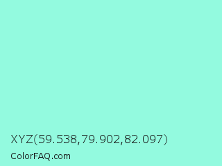 XYZ 59.538,79.902,82.097 Color is a light cyan color and the nearest color is Water Leaf #a1e9de. Hex code #93fadf and RGB value is rgb(147,250,223). In RGB color space, this color is composed of 58% red, 98% green, 87% blue, In CMYK color space, this color is composed of 41% cyan, 0% magenta, 11% yellow , 2% black , In HSL color space, this color has a hue angle of 164° , 91% saturation and 78% lightness.
