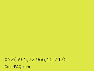 XYZ 59.5,72.966,16.742 Color is a normal yellow color and the nearest color is Maximum Green Yellow #d9e650. Hex code #dde746 and RGB value is rgb(221,231,70). In RGB color space, this color is composed of 87% red, 91% green, 27% blue, In CMYK color space, this color is composed of 4% cyan, 0% magenta, 70% yellow , 9% black , In HSL color space, this color has a hue angle of 64° , 77% saturation and 59% lightness.