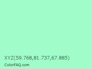 XYZ 59.768,81.737,67.885 Color is a very light green color and the nearest color is Magic Mint #aaf0d1. Hex code #9efdc9 and RGB value is rgb(158,253,201). In RGB color space, this color is composed of 62% red, 99% green, 79% blue, In CMYK color space, this color is composed of 38% cyan, 0% magenta, 21% yellow , 1% black , In HSL color space, this color has a hue angle of 147° , 96% saturation and 81% lightness.