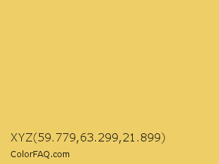 XYZ 59.779,63.299,21.899 Color is a light yellow color and the nearest color is Hansa Yellow #e9d66b. Hex code #eece67 and RGB value is rgb(238,206,103). In RGB color space, this color is composed of 93% red, 81% green, 40% blue, In CMYK color space, this color is composed of 0% cyan, 13% magenta, 57% yellow , 7% black , In HSL color space, this color has a hue angle of 46° , 80% saturation and 67% lightness.