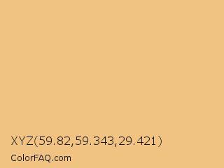XYZ 59.82,59.343,29.421 Color is a light orange color and the nearest color is Gold Sand #e6be8a. Hex code #f1c382 and RGB value is rgb(241,195,130). In RGB color space, this color is composed of 95% red, 76% green, 51% blue, In CMYK color space, this color is composed of 0% cyan, 19% magenta, 46% yellow , 5% black , In HSL color space, this color has a hue angle of 35° , 80% saturation and 73% lightness.