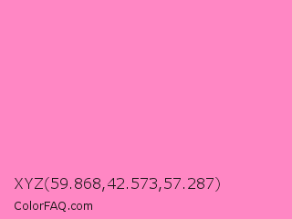 XYZ 59.868,42.573,57.287 Color is a light rose color and the nearest color is Princess Perfume #ff85cf. Hex code #ff87c4 and RGB value is rgb(255,135,196). In RGB color space, this color is composed of 100% red, 53% green, 77% blue, In CMYK color space, this color is composed of 0% cyan, 47% magenta, 23% yellow , 0% black , In HSL color space, this color has a hue angle of 330° , 100% saturation and 76% lightness.