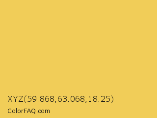 XYZ 59.868,63.068,18.25 Color is a light yellow color and the nearest color is Cream Can #f5c85c. Hex code #f1cd58 and RGB value is rgb(241,205,88). In RGB color space, this color is composed of 95% red, 80% green, 35% blue, In CMYK color space, this color is composed of 0% cyan, 15% magenta, 63% yellow , 5% black , In HSL color space, this color has a hue angle of 46° , 85% saturation and 65% lightness.
