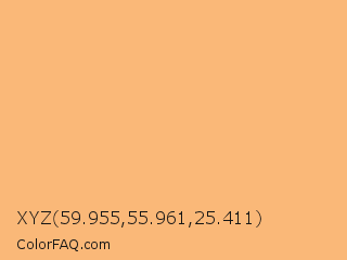 XYZ 59.955,55.961,25.411 Color is a light orange color and the nearest color is Mellow Apricot #f8b878. Hex code #fab878 and RGB value is rgb(250,184,120). In RGB color space, this color is composed of 98% red, 72% green, 47% blue, In CMYK color space, this color is composed of 0% cyan, 26% magenta, 52% yellow , 2% black , In HSL color space, this color has a hue angle of 30° , 93% saturation and 73% lightness.