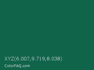 XYZ 6.007,9.719,8.038 Color is a dark green color and the nearest color is Jewel #126b40. Hex code #10644a and RGB value is rgb(16,100,74). In RGB color space, this color is composed of 6% red, 39% green, 29% blue, In CMYK color space, this color is composed of 84% cyan, 0% magenta, 26% yellow , 61% black , In HSL color space, this color has a hue angle of 161° , 72% saturation and 23% lightness.