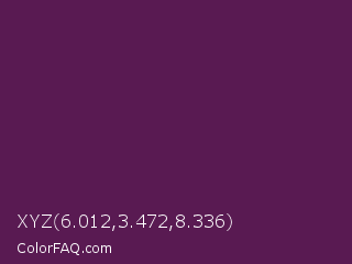 XYZ 6.012,3.472,8.336 Color is a dark magenta color and the nearest color is Bossanova #4e2a5a. Hex code #591a52 and RGB value is rgb(89,26,82). In RGB color space, this color is composed of 35% red, 10% green, 32% blue, In CMYK color space, this color is composed of 0% cyan, 71% magenta, 8% yellow , 65% black , In HSL color space, this color has a hue angle of 307° , 55% saturation and 23% lightness.