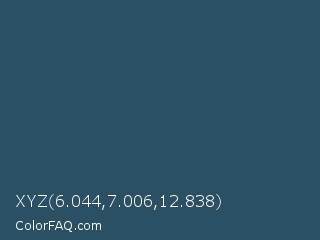 XYZ 6.044,7.006,12.838 Color is a dark blue color and the nearest color is San Juan #304b6a. Hex code #2b4f63 and RGB value is rgb(43,79,99). In RGB color space, this color is composed of 17% red, 31% green, 39% blue, In CMYK color space, this color is composed of 57% cyan, 20% magenta, 0% yellow , 61% black , In HSL color space, this color has a hue angle of 201° , 39% saturation and 28% lightness.