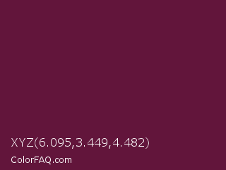 XYZ 6.095,3.449,4.482 Color is a dark rose color and the nearest color is Wine Berry #591d35. Hex code #62153b and RGB value is rgb(98,21,59). In RGB color space, this color is composed of 38% red, 8% green, 23% blue, In CMYK color space, this color is composed of 0% cyan, 79% magenta, 40% yellow , 62% black , In HSL color space, this color has a hue angle of 330° , 65% saturation and 23% lightness.