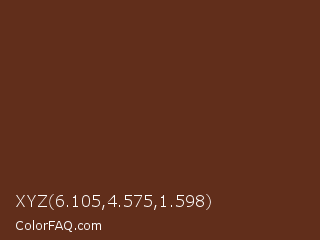 XYZ 6.105,4.575,1.598 Color is a dark orange color and the nearest color is Espresso #612718. Hex code #612e1b and RGB value is rgb(97,46,27). In RGB color space, this color is composed of 38% red, 18% green, 11% blue, In CMYK color space, this color is composed of 0% cyan, 53% magenta, 72% yellow , 62% black , In HSL color space, this color has a hue angle of 16° , 56% saturation and 24% lightness.