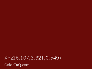 XYZ 6.107,3.321,0.549 Color is a very dark red color and the nearest color is Red Oxide #6e0902. Hex code #6a0b08 and RGB value is rgb(106,11,8). In RGB color space, this color is composed of 42% red, 4% green, 3% blue, In CMYK color space, this color is composed of 0% cyan, 90% magenta, 92% yellow , 58% black , In HSL color space, this color has a hue angle of 2° , 86% saturation and 22% lightness.