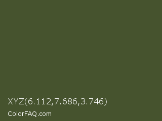 XYZ 6.112,7.686,3.746 Color is a dark green color and the nearest color is Woodland #4d5328. Hex code #46532e and RGB value is rgb(70,83,46). In RGB color space, this color is composed of 27% red, 33% green, 18% blue, In CMYK color space, this color is composed of 16% cyan, 0% magenta, 45% yellow , 67% black , In HSL color space, this color has a hue angle of 81° , 29% saturation and 25% lightness.