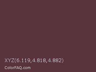 XYZ 6.119,4.818,4.882 Color is a dark red color and the nearest color is Congo Brown #593737. Hex code #59333c and RGB value is rgb(89,51,60). In RGB color space, this color is composed of 35% red, 20% green, 24% blue, In CMYK color space, this color is composed of 0% cyan, 43% magenta, 33% yellow , 65% black , In HSL color space, this color has a hue angle of 346° , 27% saturation and 27% lightness.