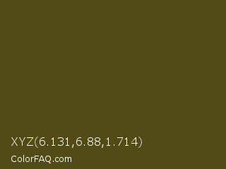 XYZ 6.131,6.88,1.714 Color is a very dark yellow color and the nearest color is Bronze Olive #4e420c. Hex code #524b15 and RGB value is rgb(82,75,21). In RGB color space, this color is composed of 32% red, 29% green, 8% blue, In CMYK color space, this color is composed of 0% cyan, 9% magenta, 74% yellow , 68% black , In HSL color space, this color has a hue angle of 53° , 59% saturation and 20% lightness.