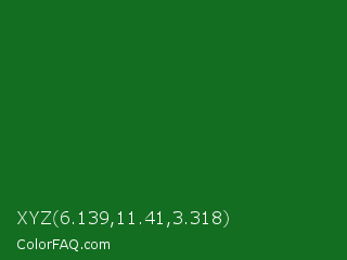 XYZ 6.139,11.41,3.318 Color is a dark green color and the nearest color is La Salle Green #087830. Hex code #146e21 and RGB value is rgb(20,110,33). In RGB color space, this color is composed of 8% red, 43% green, 13% blue, In CMYK color space, this color is composed of 82% cyan, 0% magenta, 70% yellow , 57% black , In HSL color space, this color has a hue angle of 129° , 69% saturation and 25% lightness.