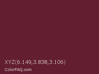 XYZ 6.149,3.838,3.106 Color is a dark red color and the nearest color is Wine Berry #591d35. Hex code #631f2f and RGB value is rgb(99,31,47). In RGB color space, this color is composed of 39% red, 12% green, 18% blue, In CMYK color space, this color is composed of 0% cyan, 69% magenta, 53% yellow , 61% black , In HSL color space, this color has a hue angle of 346° , 52% saturation and 25% lightness.