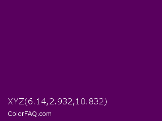 XYZ 6.14,2.932,10.832 Color is a very dark magenta color and the nearest color is Clairvoyant #480656. Hex code #59005e and RGB value is rgb(89,0,94). In RGB color space, this color is composed of 35% red, 0% green, 37% blue, In CMYK color space, this color is composed of 5% cyan, 100% magenta, 0% yellow , 63% black , In HSL color space, this color has a hue angle of 297° , 100% saturation and 18% lightness.