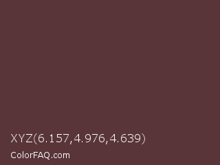 XYZ 6.157,4.976,4.639 Color is a dark red color and the nearest color is Congo Brown #593737. Hex code #59353a and RGB value is rgb(89,53,58). In RGB color space, this color is composed of 35% red, 21% green, 23% blue, In CMYK color space, this color is composed of 0% cyan, 40% magenta, 35% yellow , 65% black , In HSL color space, this color has a hue angle of 352° , 25% saturation and 28% lightness.