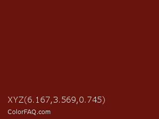 XYZ 6.167,3.569,0.745 Color is a dark red color and the nearest color is Dark Tan #661010. Hex code #69150d and RGB value is rgb(105,21,13). In RGB color space, this color is composed of 41% red, 8% green, 5% blue, In CMYK color space, this color is composed of 0% cyan, 80% magenta, 88% yellow , 59% black , In HSL color space, this color has a hue angle of 5° , 78% saturation and 23% lightness.