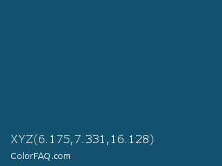 XYZ 6.175,7.331,16.128 Color is a dark blue color and the nearest color is Chathams Blue #175579. Hex code #14526f and RGB value is rgb(20,82,111). In RGB color space, this color is composed of 8% red, 32% green, 44% blue, In CMYK color space, this color is composed of 82% cyan, 26% magenta, 0% yellow , 56% black , In HSL color space, this color has a hue angle of 199° , 69% saturation and 26% lightness.