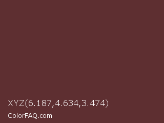 XYZ 6.187,4.634,3.474 Color is a dark red color and the nearest color is Buccaneer #622f30. Hex code #5e2f31 and RGB value is rgb(94,47,49). In RGB color space, this color is composed of 37% red, 18% green, 19% blue, In CMYK color space, this color is composed of 0% cyan, 50% magenta, 48% yellow , 63% black , In HSL color space, this color has a hue angle of 357° , 33% saturation and 28% lightness.