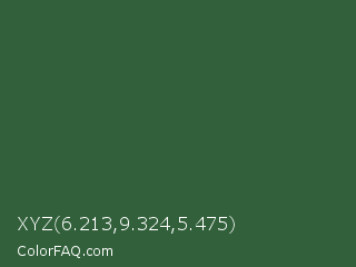 XYZ 6.213,9.324,5.475 Color is a dark green color and the nearest color is Hunter Green #355e3b. Hex code #31603a and RGB value is rgb(49,96,58). In RGB color space, this color is composed of 19% red, 38% green, 23% blue, In CMYK color space, this color is composed of 49% cyan, 0% magenta, 40% yellow , 62% black , In HSL color space, this color has a hue angle of 131° , 32% saturation and 28% lightness.