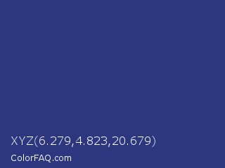 XYZ 6.279,4.823,20.679 Color is a normal blue color and the nearest color is Bay Of Many #273a81. Hex code #2d377f and RGB value is rgb(45,55,127). In RGB color space, this color is composed of 18% red, 22% green, 50% blue, In CMYK color space, this color is composed of 65% cyan, 57% magenta, 0% yellow , 50% black , In HSL color space, this color has a hue angle of 233° , 48% saturation and 34% lightness.