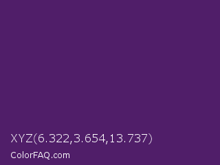 XYZ 6.322,3.654,13.737 Color is a dark purple color and the nearest color is Honey Flower #4f1c70. Hex code #501e69 and RGB value is rgb(80,30,105). In RGB color space, this color is composed of 31% red, 12% green, 41% blue, In CMYK color space, this color is composed of 24% cyan, 71% magenta, 0% yellow , 59% black , In HSL color space, this color has a hue angle of 280° , 56% saturation and 26% lightness.
