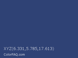 XYZ 6.331,5.785,17.613 Color is a normal blue color and the nearest color is Astronaut #283a77. Hex code #2f4275 and RGB value is rgb(47,66,117). In RGB color space, this color is composed of 18% red, 26% green, 46% blue, In CMYK color space, this color is composed of 60% cyan, 44% magenta, 0% yellow , 54% black , In HSL color space, this color has a hue angle of 224° , 43% saturation and 32% lightness.