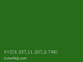 XYZ 6.337,11.207,2.749 Color is a dark green color and the nearest color is Bilbao #327c14. Hex code #266c19 and RGB value is rgb(38,108,25). In RGB color space, this color is composed of 15% red, 42% green, 10% blue, In CMYK color space, this color is composed of 65% cyan, 0% magenta, 77% yellow , 58% black , In HSL color space, this color has a hue angle of 111° , 62% saturation and 26% lightness.