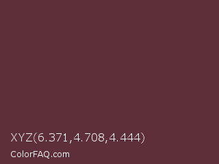 XYZ 6.371,4.708,4.444 Color is a dark red color and the nearest color is Congo Brown #593737. Hex code #5e2f39 and RGB value is rgb(94,47,57). In RGB color space, this color is composed of 37% red, 18% green, 22% blue, In CMYK color space, this color is composed of 0% cyan, 50% magenta, 39% yellow , 63% black , In HSL color space, this color has a hue angle of 347° , 33% saturation and 28% lightness.