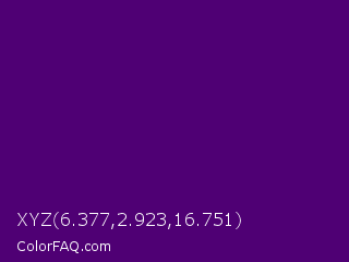 XYZ 6.377,2.923,16.751 Color is a dark purple color and the nearest color is Pigment Indigo #4b0082. Hex code #4f0074 and RGB value is rgb(79,0,116). In RGB color space, this color is composed of 31% red, 0% green, 45% blue, In CMYK color space, this color is composed of 32% cyan, 100% magenta, 0% yellow , 55% black , In HSL color space, this color has a hue angle of 281° , 100% saturation and 23% lightness.
