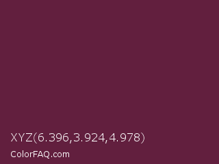 XYZ 6.396,3.924,4.978 Color is a dark rose color and the nearest color is Tawny Port #692545. Hex code #621f3e and RGB value is rgb(98,31,62). In RGB color space, this color is composed of 38% red, 12% green, 24% blue, In CMYK color space, this color is composed of 0% cyan, 68% magenta, 37% yellow , 62% black , In HSL color space, this color has a hue angle of 332° , 52% saturation and 25% lightness.
