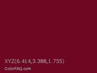 XYZ 6.414,3.388,1.755 Color is a very dark rose color and the nearest color is Black Rose #67032d. Hex code #6b0721 and RGB value is rgb(107,7,33). In RGB color space, this color is composed of 42% red, 3% green, 13% blue, In CMYK color space, this color is composed of 0% cyan, 93% magenta, 69% yellow , 58% black , In HSL color space, this color has a hue angle of 344° , 88% saturation and 22% lightness.