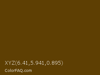 XYZ 6.41,5.941,0.895 Color is a very dark orange color and the nearest color is Saddle Brown #583401. Hex code #5e3f03 and RGB value is rgb(94,63,3). In RGB color space, this color is composed of 37% red, 25% green, 1% blue, In CMYK color space, this color is composed of 0% cyan, 33% magenta, 97% yellow , 63% black , In HSL color space, this color has a hue angle of 40° , 94% saturation and 19% lightness.