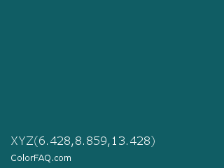 XYZ 6.428,8.859,13.428 Color is a dark cyan color and the nearest color is Deep Sea Green #095859. Hex code #105d64 and RGB value is rgb(16,93,100). In RGB color space, this color is composed of 6% red, 36% green, 39% blue, In CMYK color space, this color is composed of 84% cyan, 7% magenta, 0% yellow , 61% black , In HSL color space, this color has a hue angle of 185° , 72% saturation and 23% lightness.