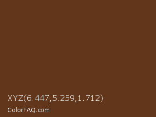 XYZ 6.447,5.259,1.712 Color is a dark orange color and the nearest color is Jambalaya #5b3013. Hex code #61361b and RGB value is rgb(97,54,27). In RGB color space, this color is composed of 38% red, 21% green, 11% blue, In CMYK color space, this color is composed of 0% cyan, 44% magenta, 72% yellow , 62% black , In HSL color space, this color has a hue angle of 23° , 56% saturation and 24% lightness.