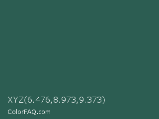 XYZ 6.476,8.973,9.373 Color is a dark cyan color and the nearest color is Stromboli #325d52. Hex code #2c5d52 and RGB value is rgb(44,93,82). In RGB color space, this color is composed of 17% red, 36% green, 32% blue, In CMYK color space, this color is composed of 53% cyan, 0% magenta, 12% yellow , 64% black , In HSL color space, this color has a hue angle of 167° , 36% saturation and 27% lightness.