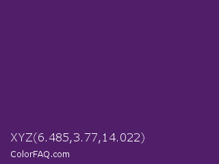 XYZ 6.485,3.77,14.022 Color is a dark purple color and the nearest color is Honey Flower #4f1c70. Hex code #511f6a and RGB value is rgb(81,31,106). In RGB color space, this color is composed of 32% red, 12% green, 42% blue, In CMYK color space, this color is composed of 24% cyan, 71% magenta, 0% yellow , 58% black , In HSL color space, this color has a hue angle of 280° , 55% saturation and 27% lightness.