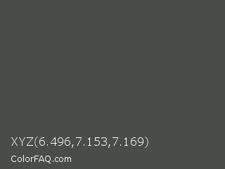 XYZ 6.496,7.153,7.169 Color is a dark green color and the nearest color is Outer Space #414a4c. Hex code #484d48 and RGB value is rgb(72,77,72). In RGB color space, this color is composed of 28% red, 30% green, 28% blue, In CMYK color space, this color is composed of 6% cyan, 0% magenta, 6% yellow , 70% black , In HSL color space, this color has a hue angle of 120° , 3% saturation and 29% lightness.
