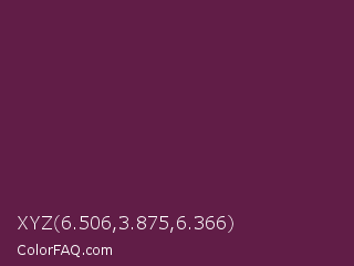 XYZ 6.506,3.875,6.366 Color is a dark magenta color and the nearest color is Tawny Port #692545. Hex code #611d47 and RGB value is rgb(97,29,71). In RGB color space, this color is composed of 38% red, 11% green, 28% blue, In CMYK color space, this color is composed of 0% cyan, 70% magenta, 27% yellow , 62% black , In HSL color space, this color has a hue angle of 323° , 54% saturation and 25% lightness.
