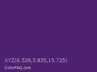 XYZ 6.529,3.835,15.725 Color is a dark purple color and the nearest color is Honey Flower #4f1c70. Hex code #4d2170 and RGB value is rgb(77,33,112). In RGB color space, this color is composed of 30% red, 13% green, 44% blue, In CMYK color space, this color is composed of 31% cyan, 71% magenta, 0% yellow , 56% black , In HSL color space, this color has a hue angle of 273° , 54% saturation and 28% lightness.