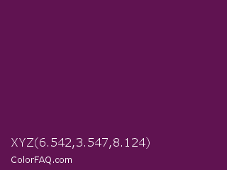 XYZ 6.542,3.547,8.124 Color is a dark magenta color and the nearest color is Pompadour #660045. Hex code #601351 and RGB value is rgb(96,19,81). In RGB color space, this color is composed of 38% red, 7% green, 32% blue, In CMYK color space, this color is composed of 0% cyan, 80% magenta, 16% yellow , 62% black , In HSL color space, this color has a hue angle of 312° , 67% saturation and 23% lightness.