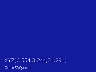 XYZ 6.554,3.244,31.291 Color is a normal blue color and the nearest color is Indigo Dye #091f92. Hex code #131a9b and RGB value is rgb(19,26,155). In RGB color space, this color is composed of 7% red, 10% green, 61% blue, In CMYK color space, this color is composed of 88% cyan, 83% magenta, 0% yellow , 39% black , In HSL color space, this color has a hue angle of 237° , 78% saturation and 34% lightness.
