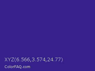 XYZ 6.566,3.574,24.77 Color is a normal indigo color and the nearest color is Pixie Powder #391285. Hex code #341f8b and RGB value is rgb(52,31,139). In RGB color space, this color is composed of 20% red, 12% green, 55% blue, In CMYK color space, this color is composed of 63% cyan, 78% magenta, 0% yellow , 45% black , In HSL color space, this color has a hue angle of 252° , 64% saturation and 33% lightness.